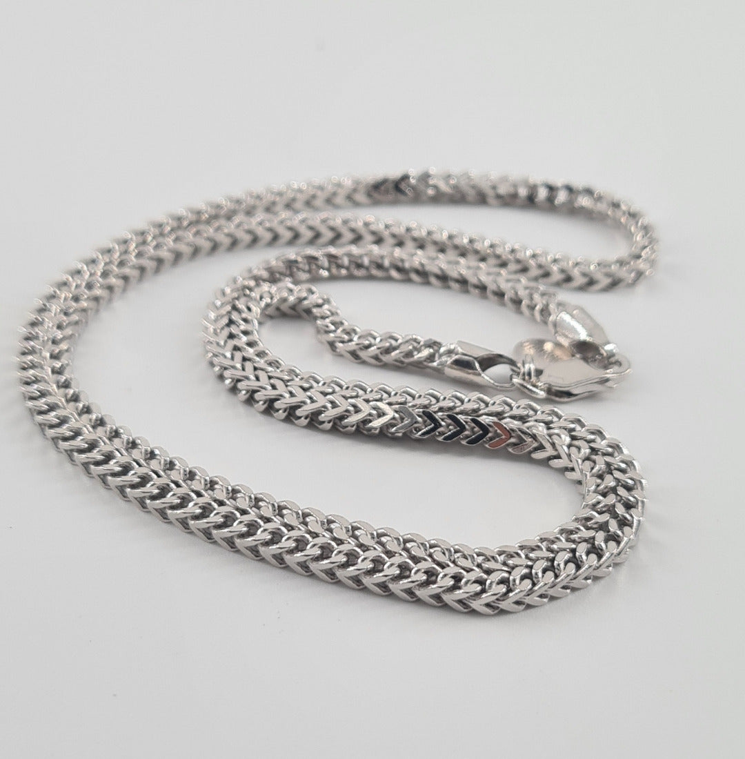 This men's chain is crafted from sterling silver and features a Franco design. Franco chains are known for their square or rectangular links, creating a distinct look compared to other chain styles like curb or rope chains. The chain's length is 50.8 cm (approximately 20 inches), and it weighs 17.7 grams. The presence of hallmarks indicates that the chain's silver content has been officially verified by the essay office in Dublin castle.